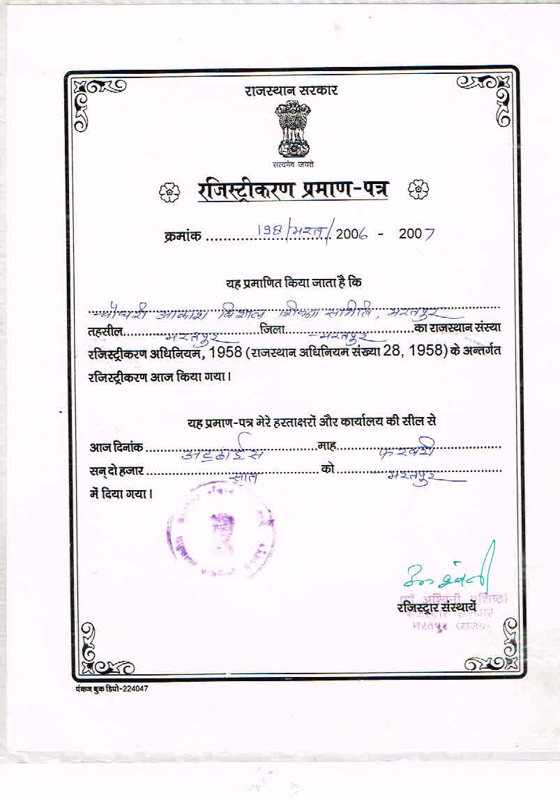 Our Society was certified in 28 Feb. 2007, Educated and dedicated people from every class of the society. As such ninteen People were selected, Through their cooperation and coordination a society was established and it was registered from distt. Bharatpur deptt. of registration Govt. Of Raj. namely Central Public Educational Society.